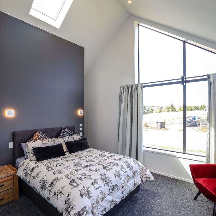 Our tastefully furnished main guest bedroom features two skylights installed to allow guests to lay back and stargaze from the comfort of their own bed. This room also has direct access to the main bathroom. Although this main bedroom is the pick of the bunch you will find the other bedrooms equally beautiful, with a view of Lake Tekapo from each room – even while soaking in the bath!